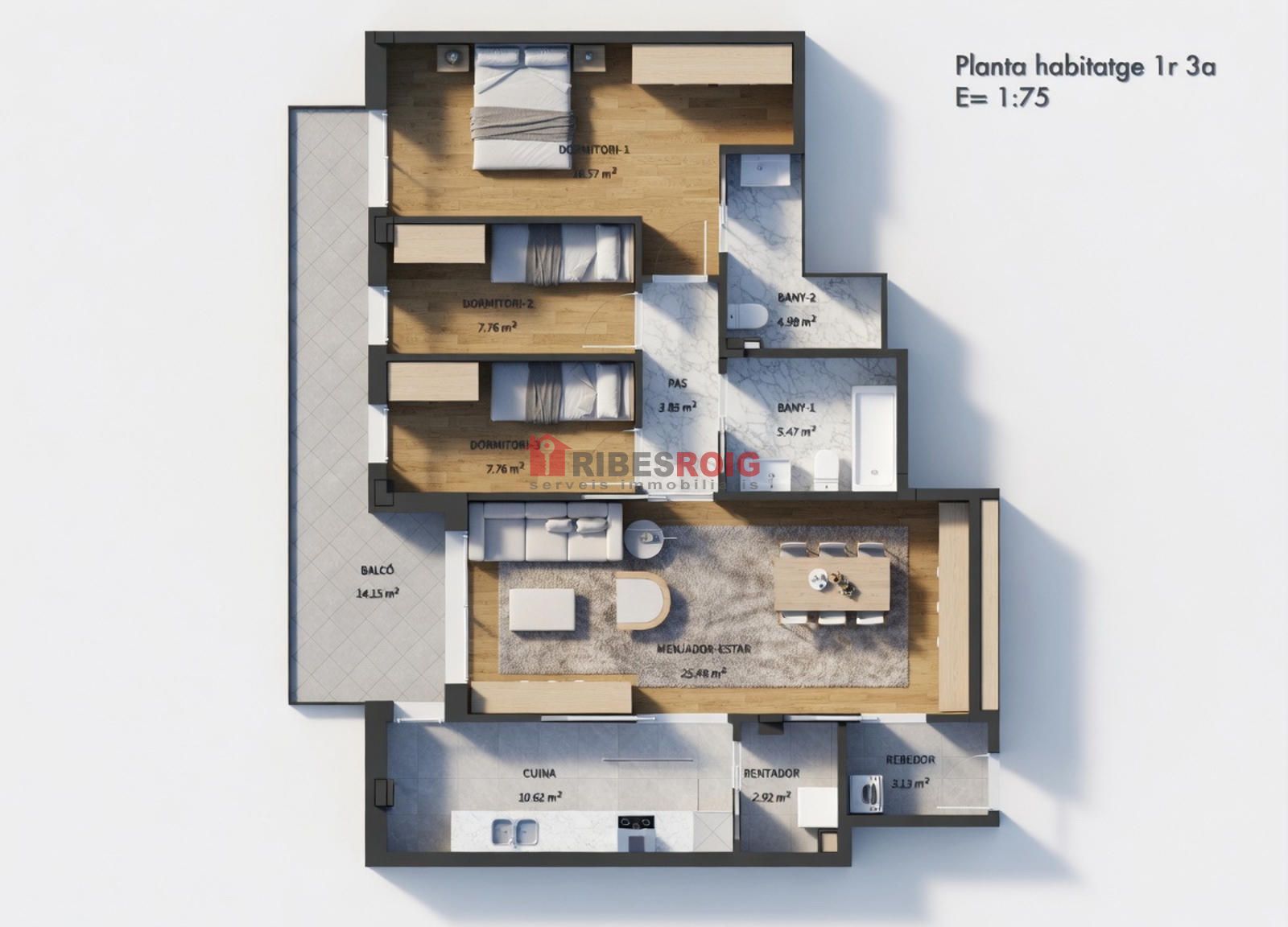 En ingressar, us rebran amplis espais perfectament distribuïts. La cuina, independent i equipada, compta amb 9m² de superfície, brindant-te un entorn ideal per preparar els teus plats preferits. El lluminós saló, amb una superfície de 22 m², us convida a relaxar-vos i gaudir de moments inoblidables en un ambient acollidor. A més, l'habitatge disposa d'una terrassa de 15 m², on podreu gaudir de l'aire lliure i les vistes clares, creant el vostre propi oasi privat.